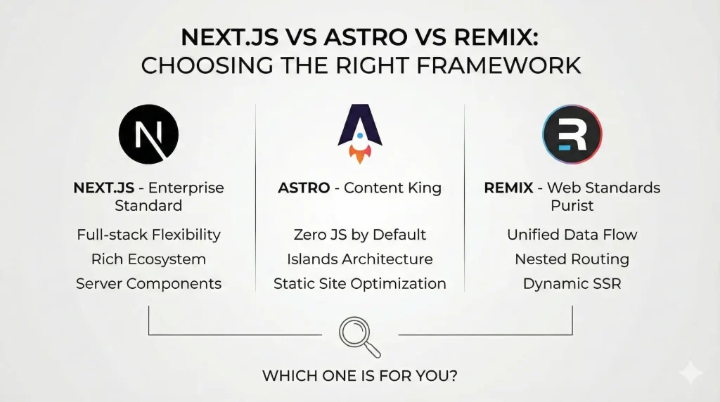 Currently, the three big contenders in the React ecosystem (though one is strictly “React-optional”) are Next.js, Astro, and Remix. While they share similarities, they have vastly different philosophies on how to build the web.